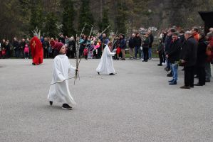 Während er dahinritt, breiteten die Jünger ihre Kleider auf dem Weg aus. Als er sich schon den Abhang des Ölbergs näherte, begann die Schar der Jünger freudig und mit lauter Stimme Gott zu loben wegen all der Machttaten, die sie gesehen hatten. Sie riefen: Gesegnet sei der König, der kommt im Namen des Herrn. Im Himmel Friede und Ehre in der Höhe! (Lk 19,36f)