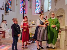 Nach dem Ernteumzug wurde die Erntedankmesse gefeiert. Musikalisch gestaltet wurde diese durch den Musikverein Trattenbach. Anschließend wurde zum Frühschoppen in das Gemeindehaus eingeladen.